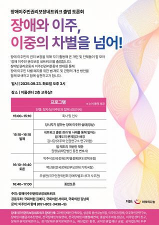 9월 23일, 한국장애인개발원 이룸센터에서 ‘장애이주민 권리보장 네트워크’출범을 기념하는 토론회가 성황리에 개최되었습니다. ‘장애이주민곁에’ 사업의 일환으로 이주민의 권리 향상과 제도 개선을 위한 첫 걸음을 내딛는 뜻깊은 자리였습니다.